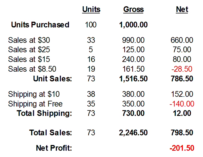 Thinking he will quickly sell all 100 units at $20 profit, plus a $4 shipping markup, he’s counting on taking in $2,400, and making a net profit of $1,400.